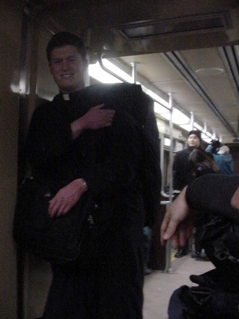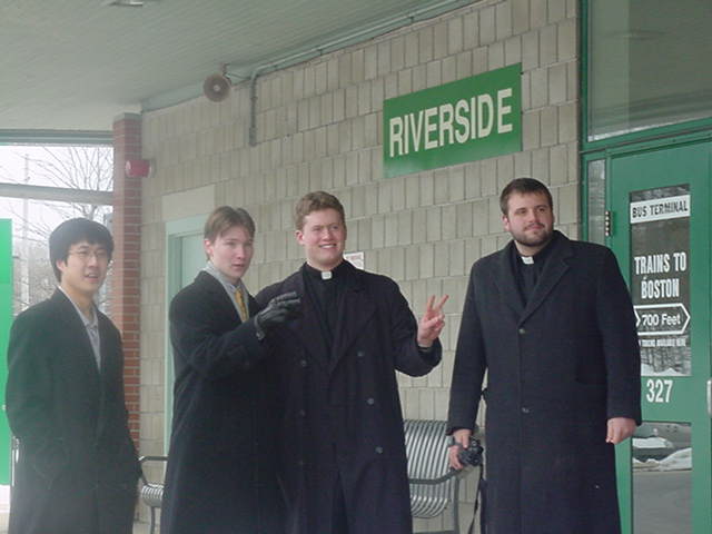 Peng, Janse, Fr Mike, & Fr Ray at Riverside train station in Boston after Harvard